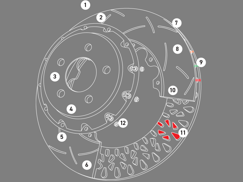 L'utilisation de chapeaux en aluminium réduit le poids non suspendu des disques de frein, tout en permettant une expansion radiale uniforme des disques en fonte dans les anneaux et une réduction du transfert de chaleur des disques vers le moyeu via les chapeaux en aluminium.